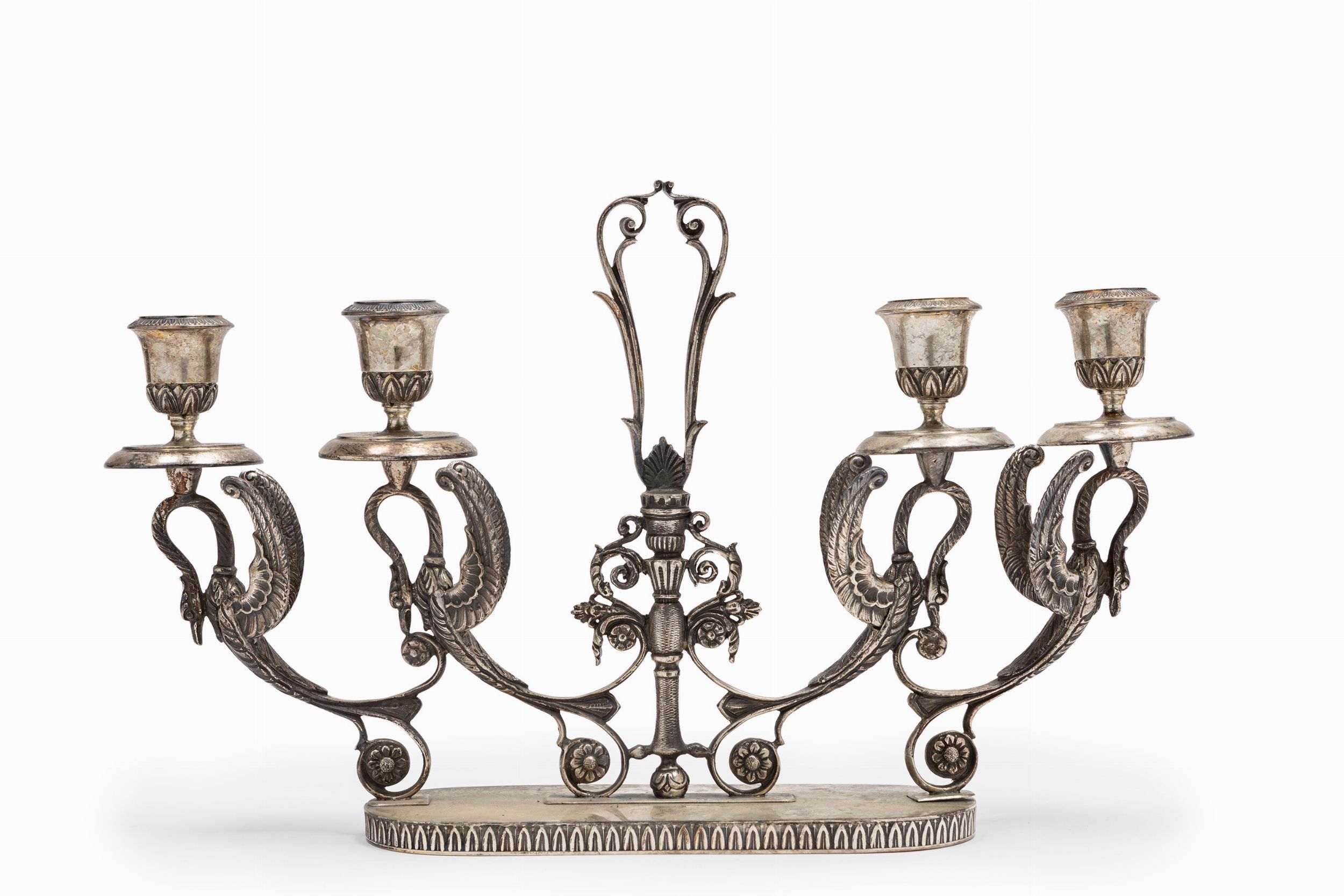 Italia, XX secolo base ovale con decoro in stile Impero, a quattro fiamme poggianti su cigni.