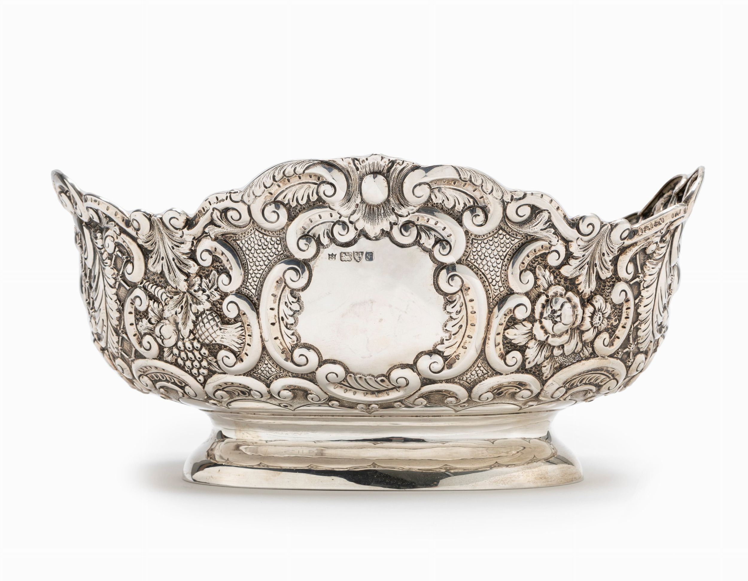 Chester, XX Secolo base ovale, corpo decorato a volute, motivi floreali e frutta realizzati a sbalzo.