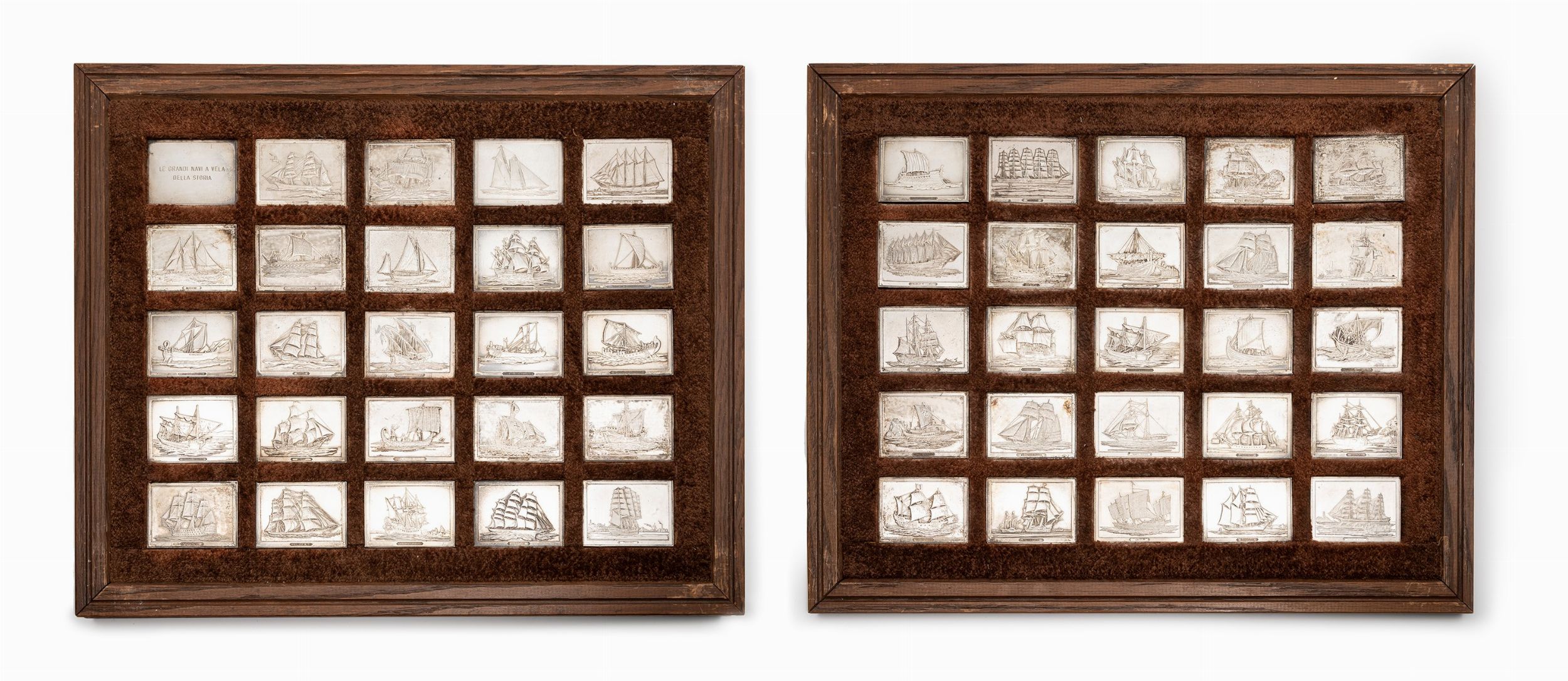a forma di lingotto, con raffigurate grandi navi a vela della storia, entro cornice in legno.