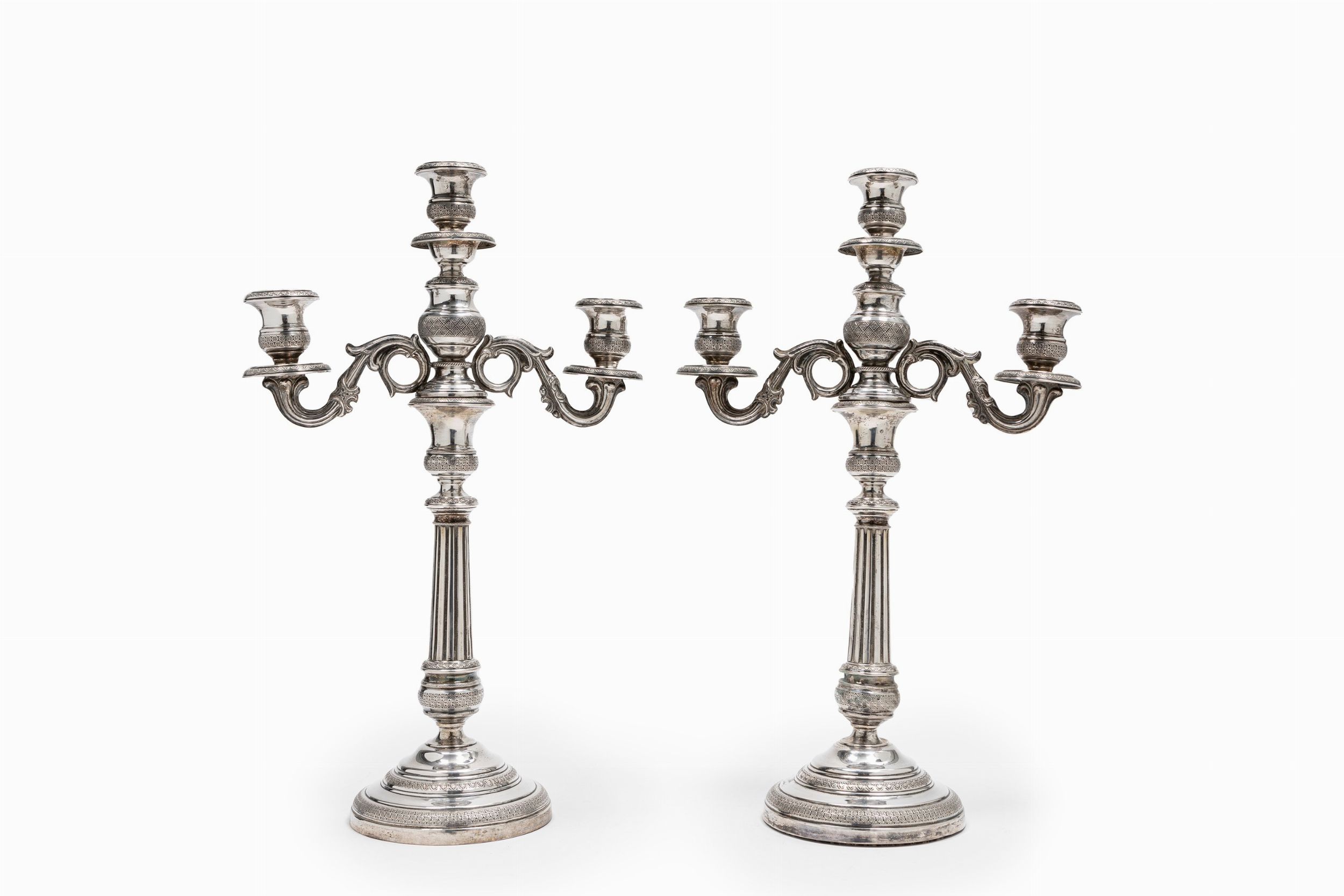 Genova, inizio XIX Secolo base rotonda, fusto scanalato, decoro in stile Impero, punzone croce mauriziana e delfino arrotolato, zavorrati, difetti (piccola ammaccatura).