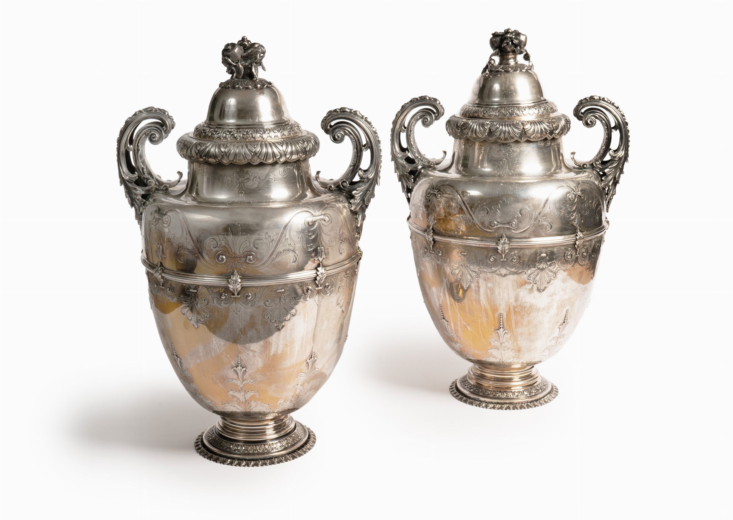 Italia, XX secolo realizzati ad anfora, base rotonda con decoro a sbalzo, fusto ricco di volute ed incisioni floreali, manici a ricciolo, coperchio sormontato da cesto di fiori e frutti, reca punzoni del Fascio, difetti (piccole ammaccature).
