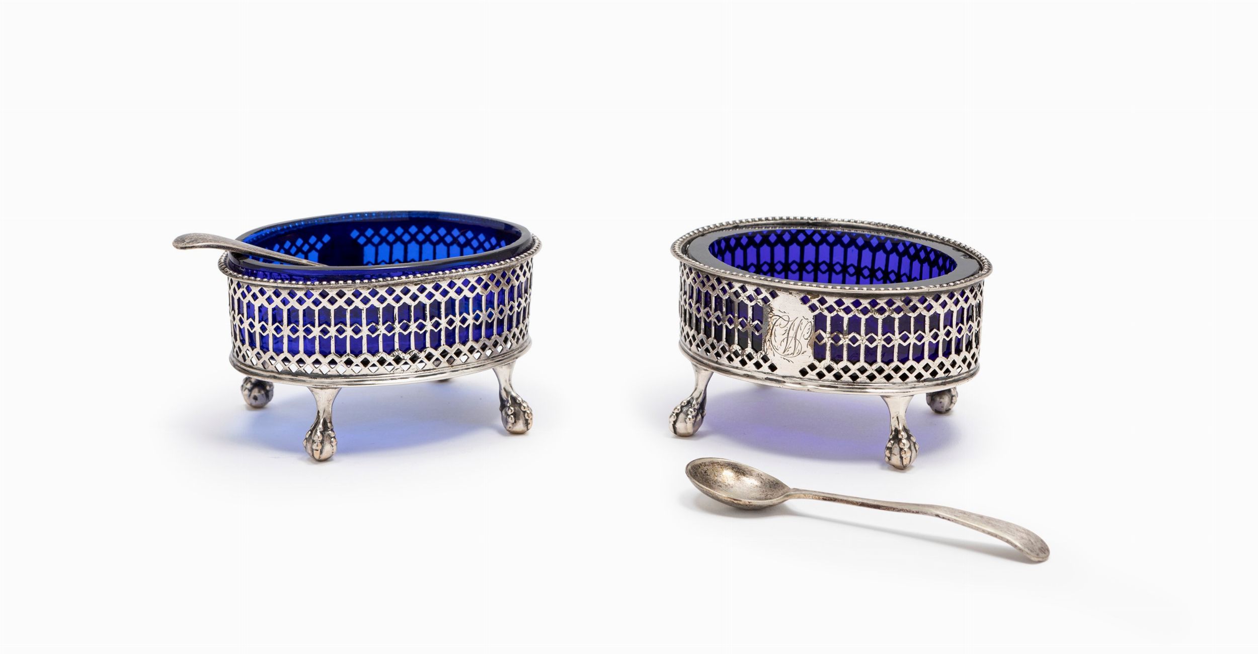 Città di Sheffield, 1813 di forma ovale, piedini zoomorfi, decoro traforato con iniziali, vetri blu e cucchiaini non in argento.