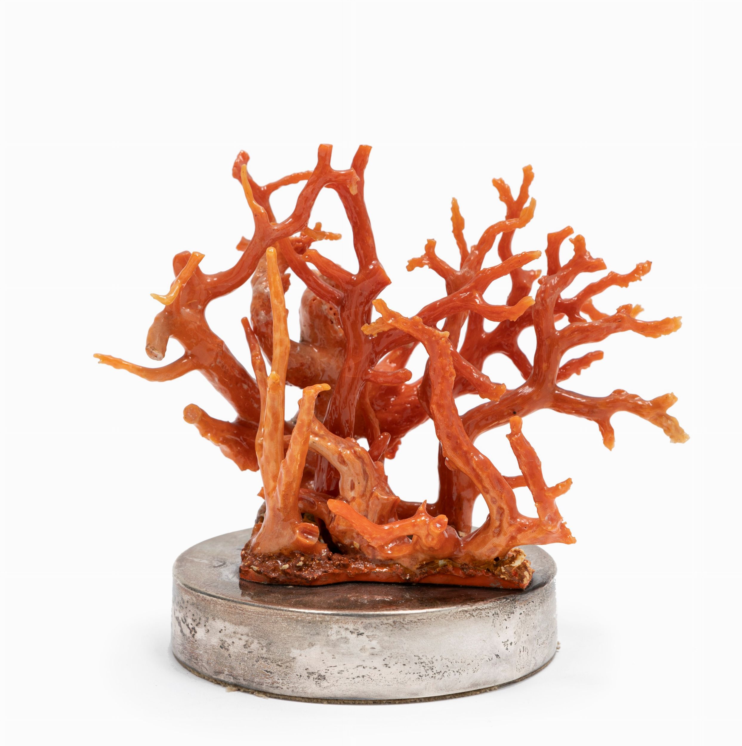 Italia, XX Secolo con rami di corallo color rosso arancio poggianti su base rotonda in argento.