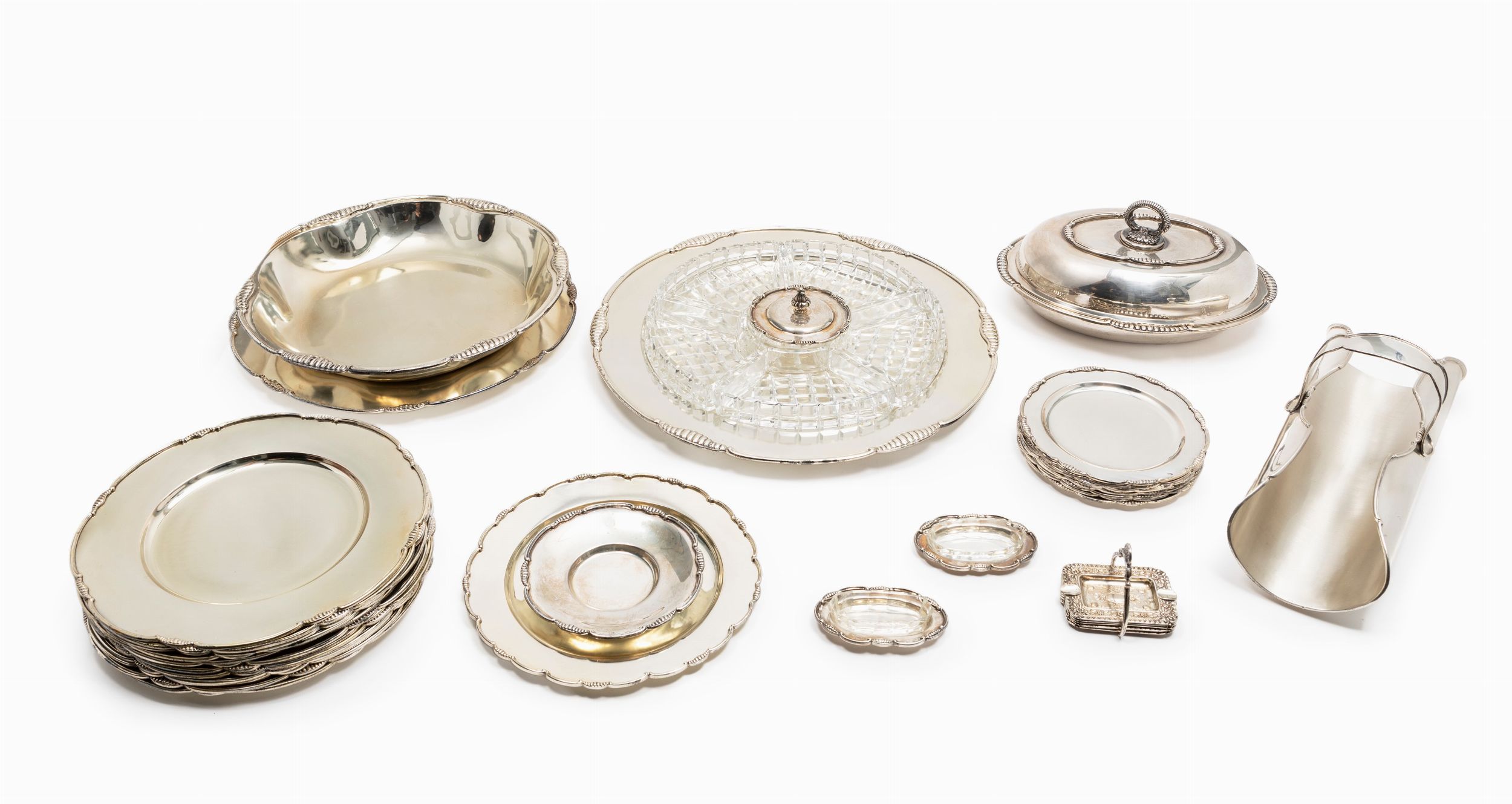 12 sottopiatti, 1 grande piatto porta antipasti con divisori in cristallo, 2 piatti da portata, 1 porta grissini con manico, 1 zuppiera ovale con coperchio, 8 piattini, 2 piatti di servizio, 2 salierine con vetri, 1 contenitore con posaceneri da tavolo con manico.