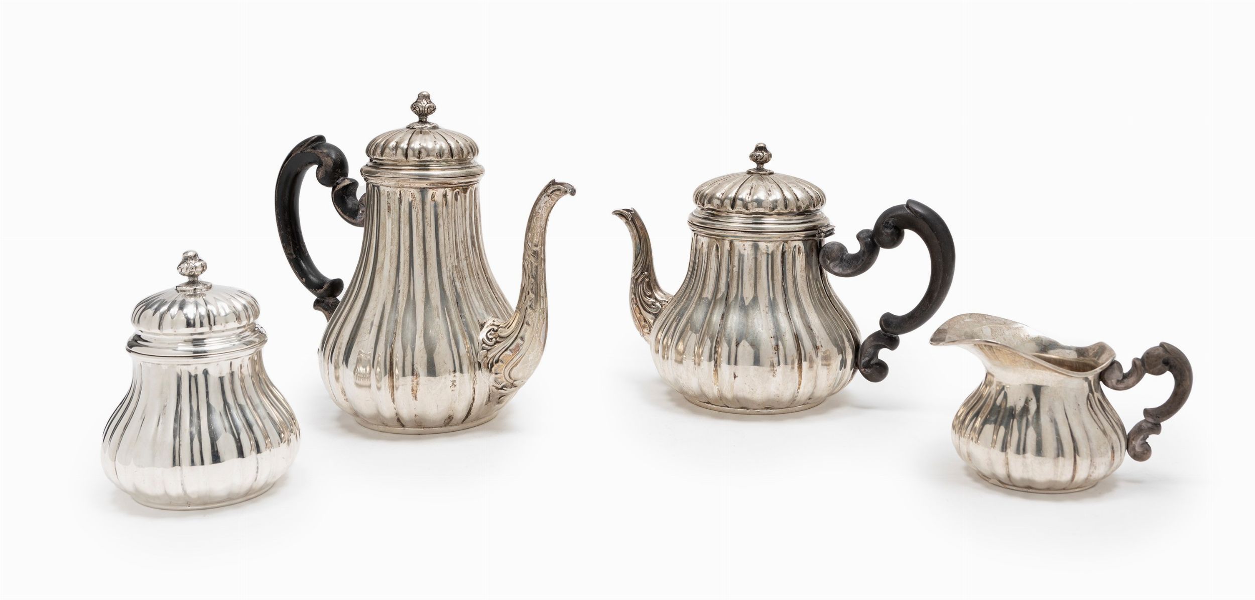 Italia, XX Secolo composto da caffettiera, teiera, lattiera e zuccheriera, manici in legno, decoro scanalato, punzoni del Fascio.