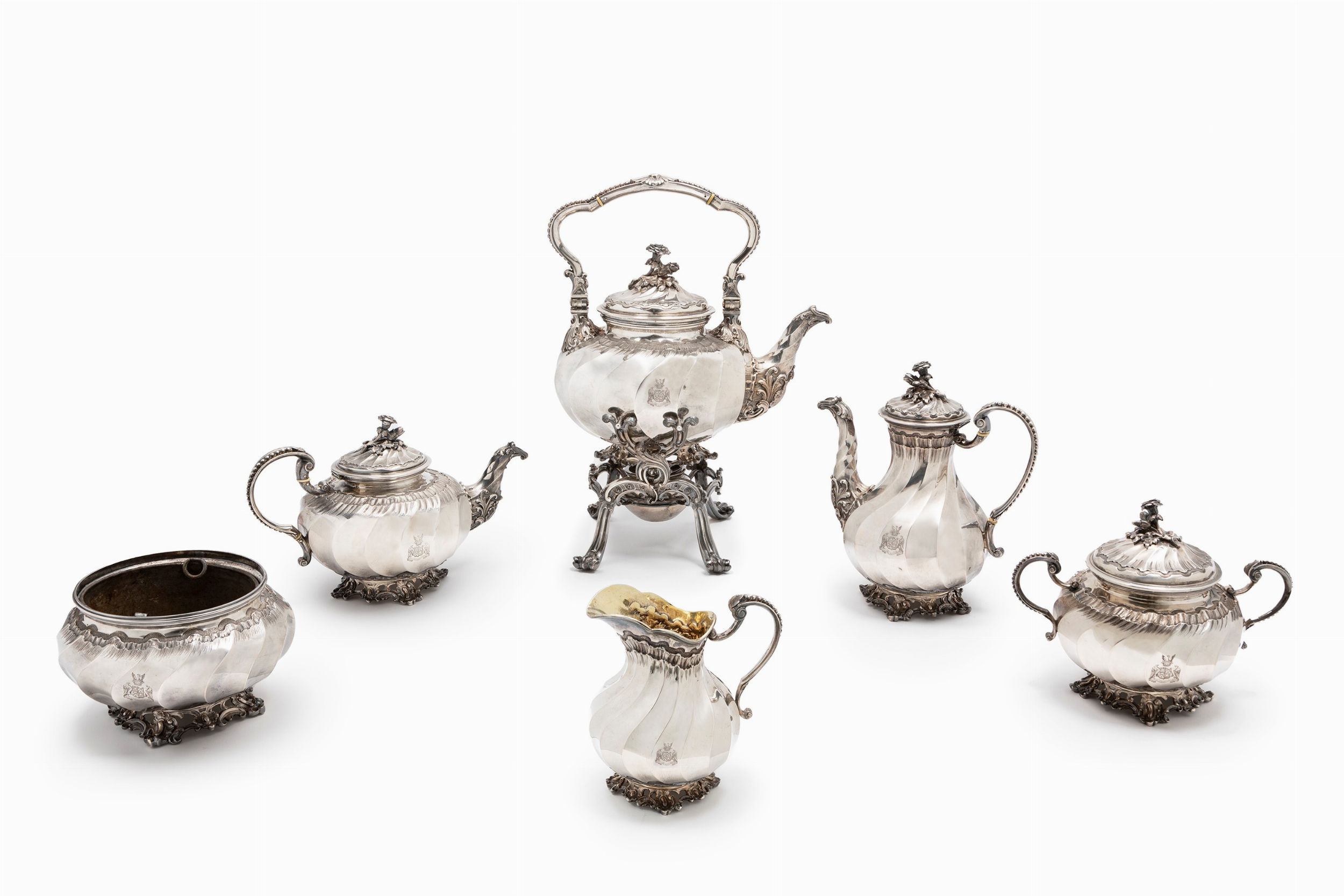 Francia, fine XIX secolo composto da samovar, caffettiera, teiera, zuccheriera, lattiera e ciotola, con decori floreali e stemmi nobiliari.