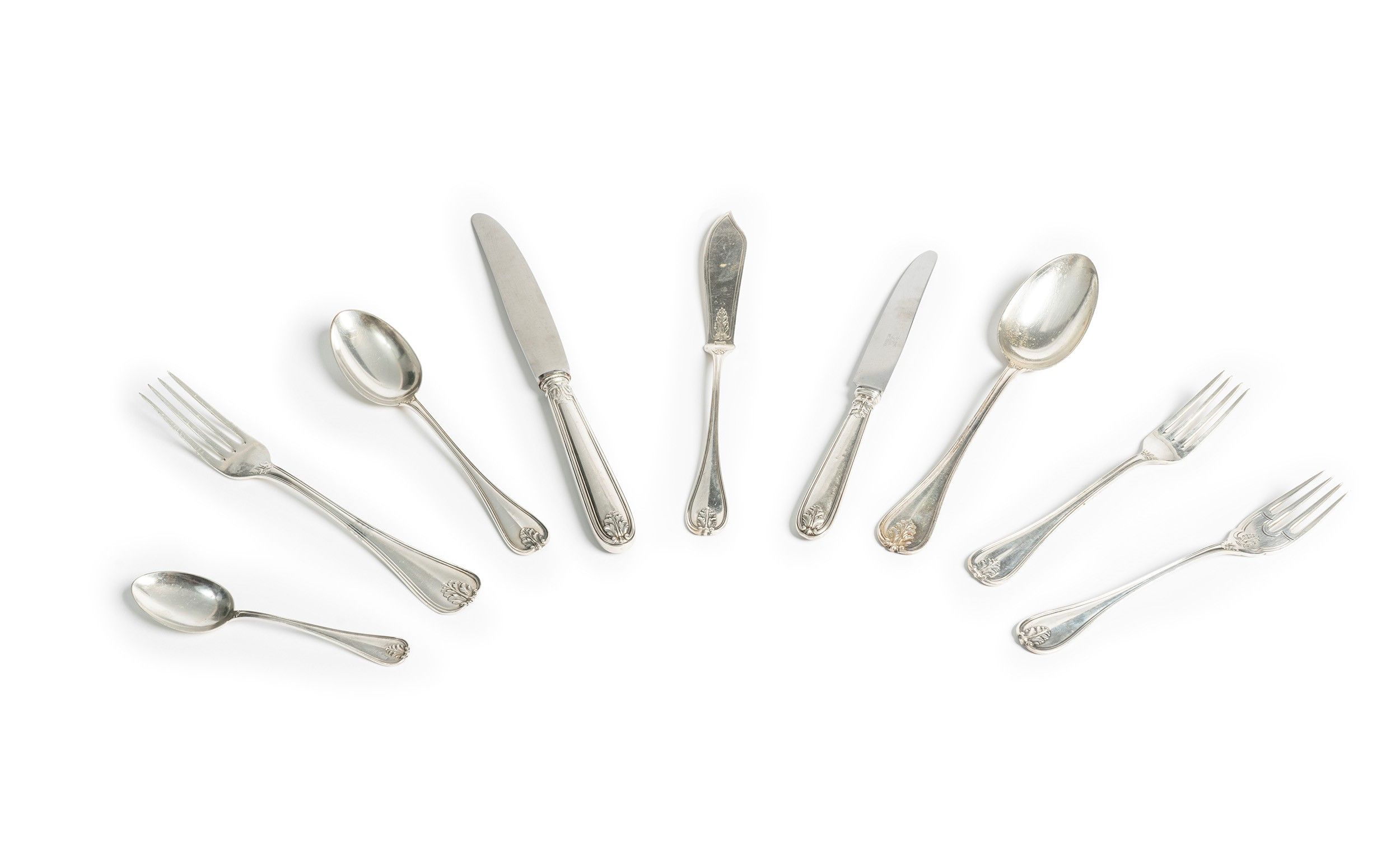 composto da: 12 cucchiai grandi, 12 cucchiai medi, 12 cucchiaini, 12 forchette grandi, 12 forchette medie, 12 forchette pesce, 12 coltelli pesce, 12 coltelli grandi e 12 coltelli medi, con scatola in legno.
