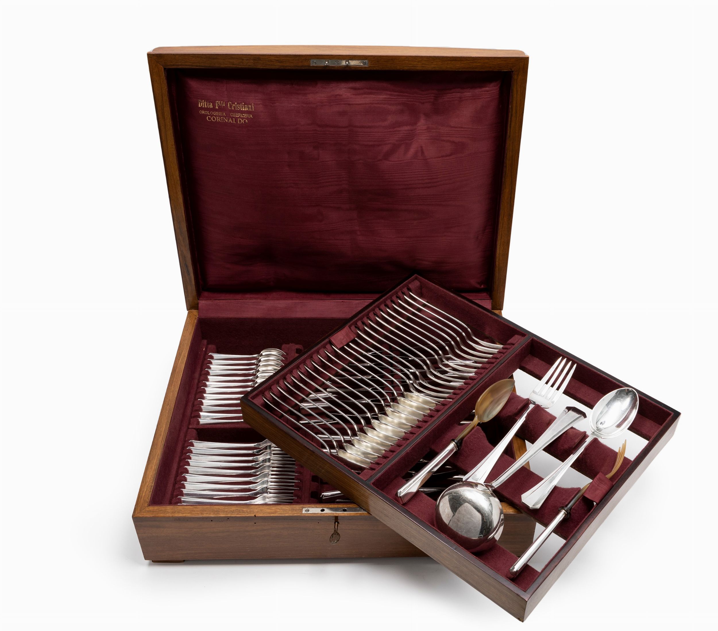 Italia, XX Secolo composto da 12 forchette grandi, 12 cucchiai grandi, 12 coltelli grandi, 12 forchette da frutta, 12 coltelli da frutta, 12 cucchiaini da tè e 5 serviti, con cassa in legno.