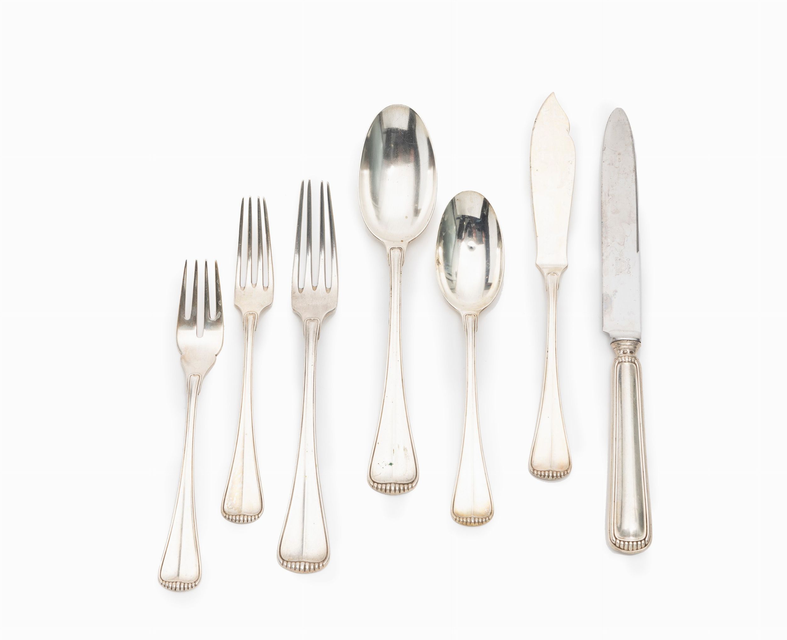 composto da 5 cucchiai grandi, 12 coltelli da pesce, 12 cucchiai da dolce, 16 forchette grandi, 13 coltelli grandi, 12 forchette da pesce, 7 forchette da frutta.