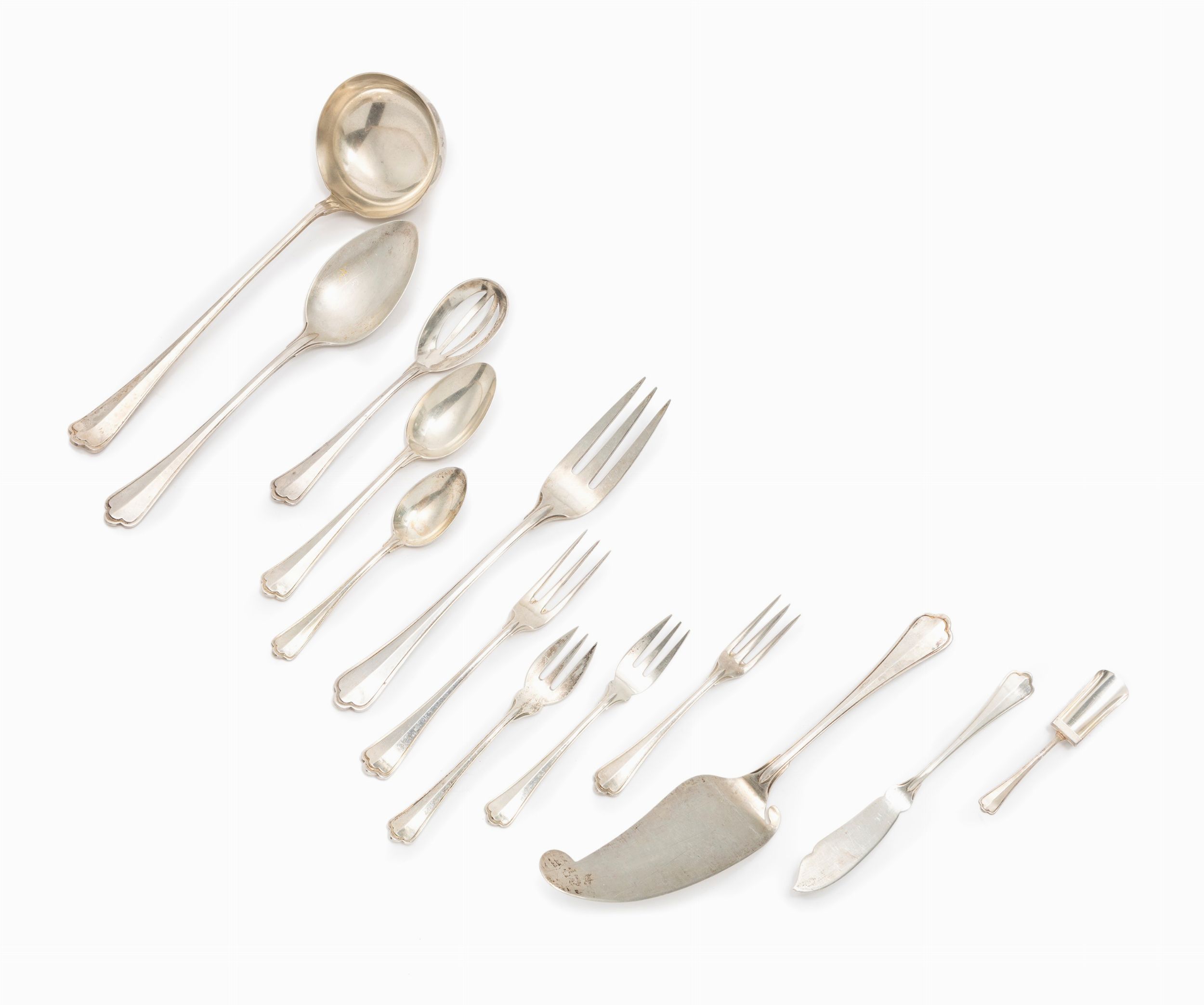 27 forchette grandi, 28 forchette medie, 6 forchette da pesce, 12 forchette da dolce, 6 coltelli da pesce, 14 cucchiai grandi, 13 cucchiai medi, 1 cucchiaino da zucchero e 8 serviti.