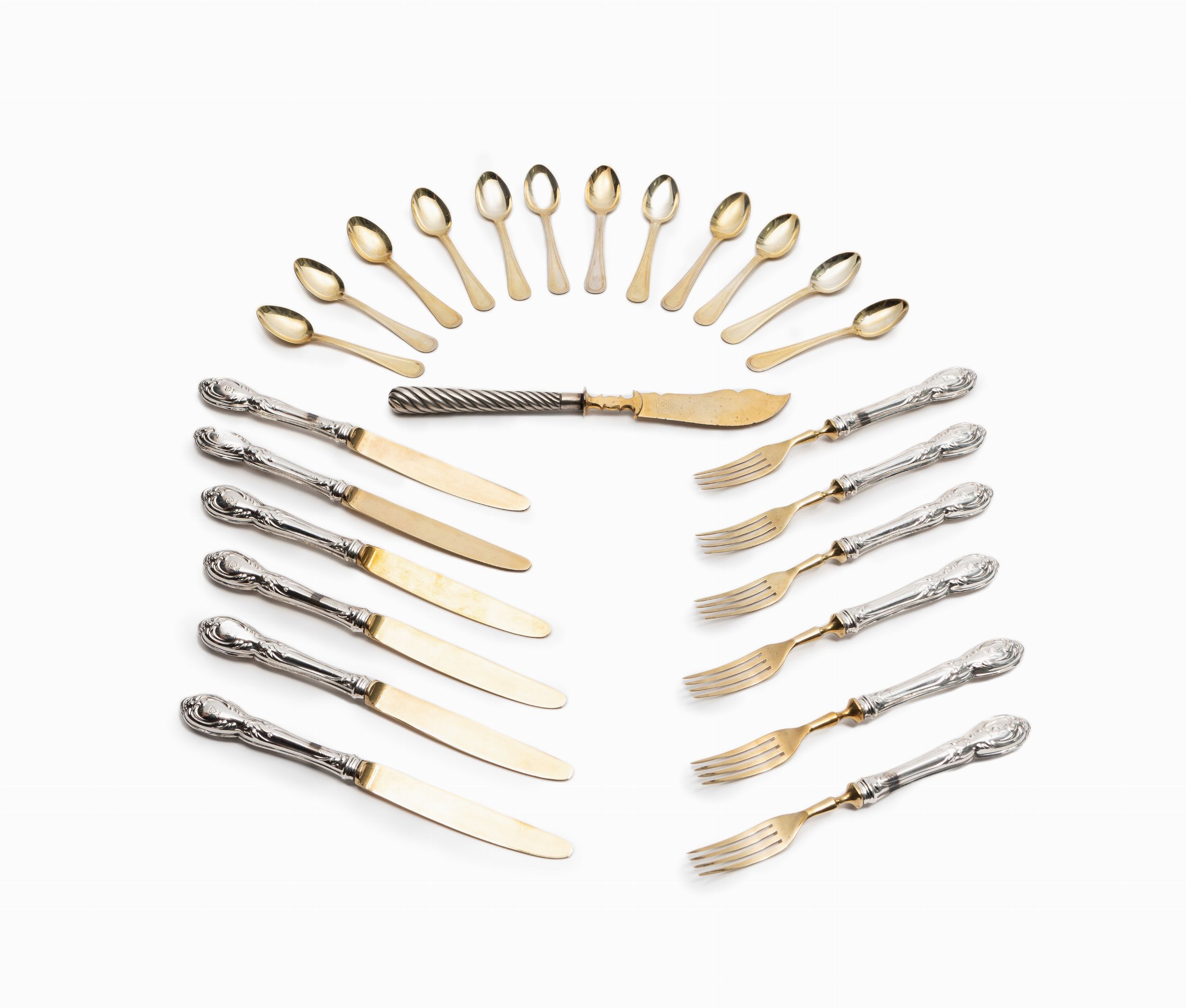 Italia, XX Secolo composto da 12 cucchiaini da caffè, 6 forchettine da dolce, 6 coltelli da dolce e 1 paletta da dolce, con stemma nobiliare dei Borromeo.