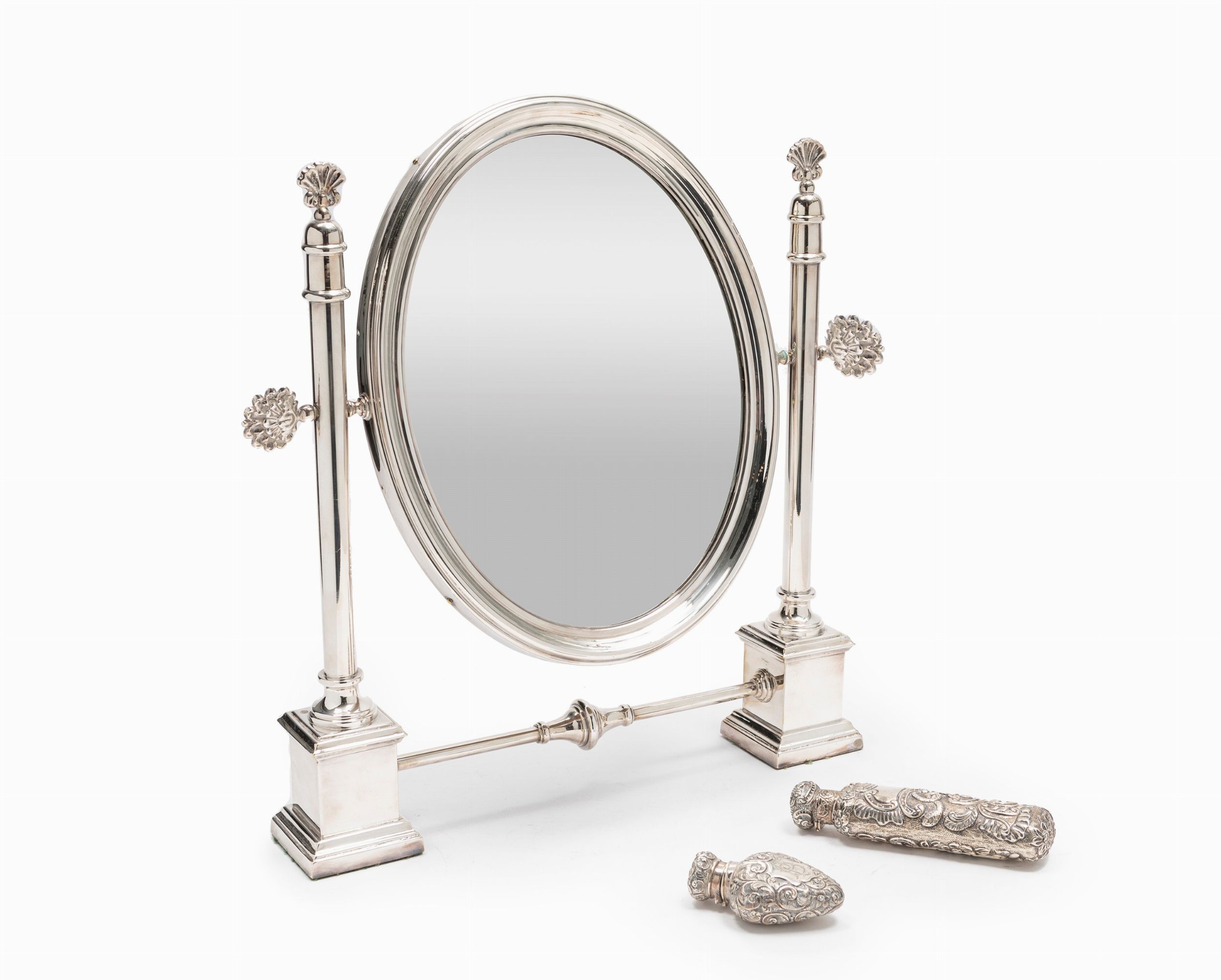 XIX-XX Secolo una specchiera da toilette e due porta profumi.
