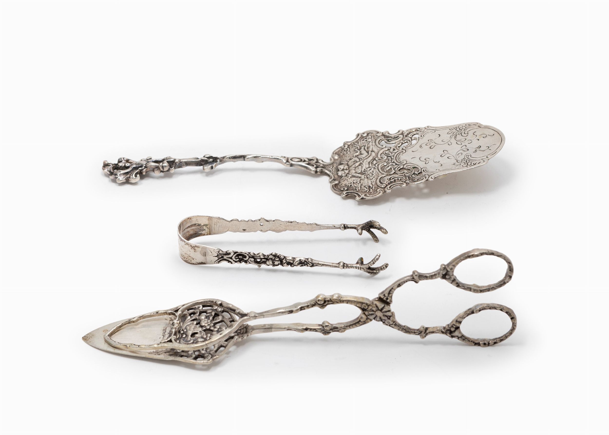 Italia, XX secolo composto da paletta, pinza e pinza con paletta, decorati con putti e decori floreali.