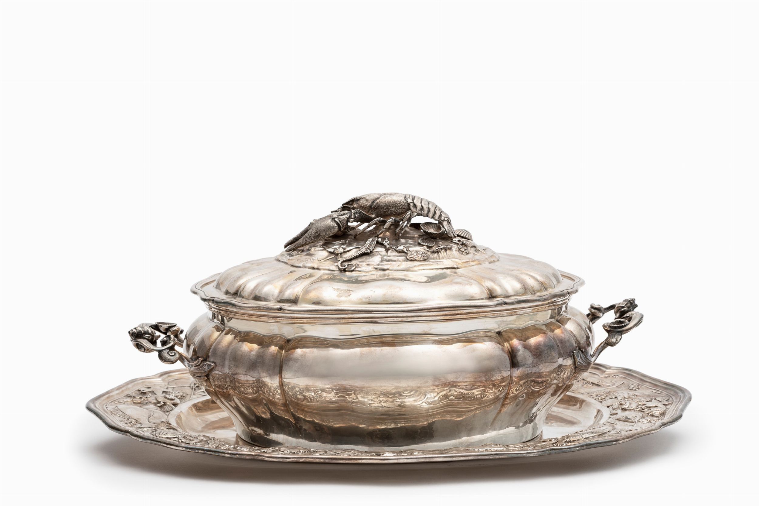 vassoio con ricco decoro a rilievo con soggetto marino e zuppiera con manici decorati da conchiglie e coperchio impreziosito da aragosta, reca punzoni del Fascio.