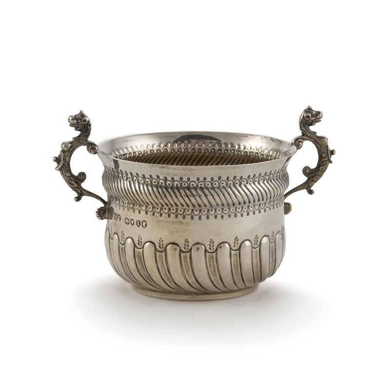 in argento, la parte inferiore baccellata, due anse terminanti ad animali fantastici, diam. cm 9, g 120