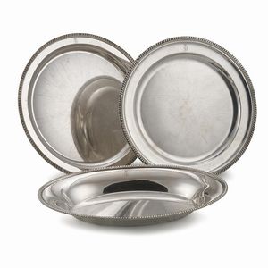 TRE ALZATE, FINE SECOLO XIX in metallo argentato, piano con stemma nobiliare inciso e motto PER MARE, PER TERRAS, [..]