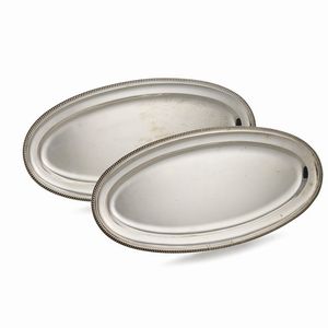 COPPIA DI VASSOI, MILANO, SECOLO XX in argento di forma ovale con bordo baccellato, cm 65x31, complessivi g 3700. [..]