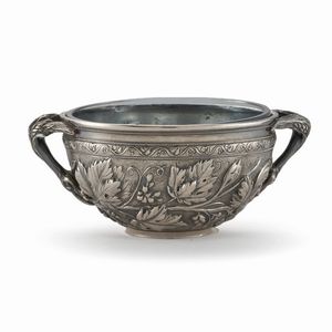 COPPA, NAPOLI, INIZI SECOLO XX in argento decorato da tralci di vite, due anse realizzate come serti riuniti da [..]