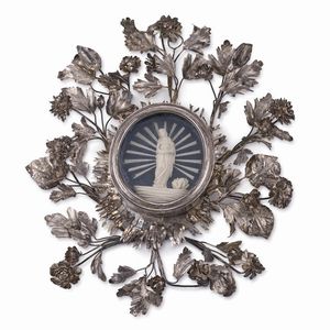CORNICE PALERMO, SECOLO XVIII in argento, di forma ovale, profilo a raggera e cornice di fiori e foglie, con teca [..]