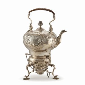 SAMOVAR, LONDRA, 1757 in argento, sostegno tripode con fornellino, corpo globulare sbalzato a fiori, presa del [..]
