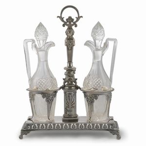 OLIERA, MILANO, SECOLO XIX, ARGENTIERE LUCA FRANCESCHINI in argento, base rettangolare traforata, porta ampolle [..]