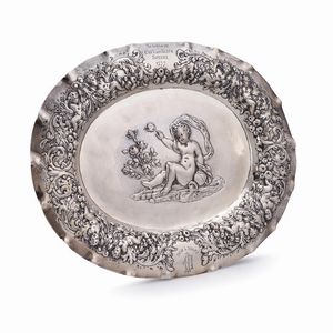 GRANDE PIATTO DA PARATA, GERMANIA, INIZI SECOLO XVIII in argento sbalzato, al centro del cavetto Europa fra putti [..]