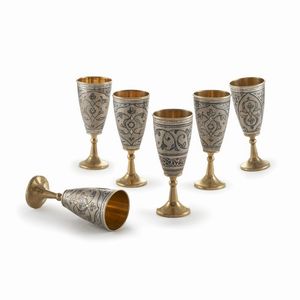 SEI BICCHIERINI, PROBABILMENTE RUSSIA, INIZI SECOLO XX in argento, argento dorato e niello, alt. cm 11,5, complessivi [..]