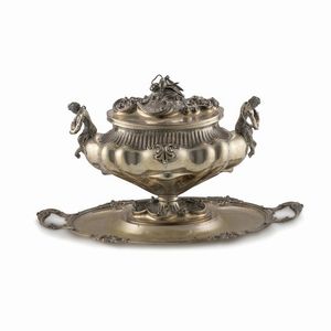 ZUPPIERA CON PRESENTOIRE, SECOLO XX in argento, vassoio ovale biansato, zuppiera sbalzata con due anse realizzate [..]