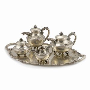 SERVITO EGOISTE, PARIGI, FINE SECOLO XIX, ARGENTIERE FALAMANT & FILS composto di vassoio a due manici, caffettiera, [..]