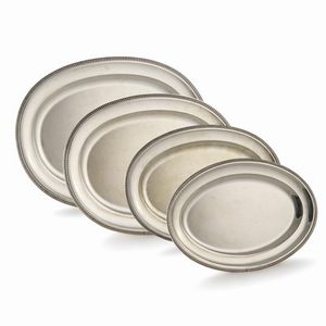 QUATTRO COPPIE DI VASSOI, MILANO, SECOLO XX, ARGENTIERE CAPUTI di forma ovale in argento con profili baccellati, [..]
