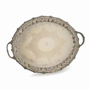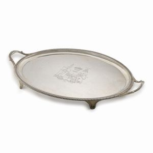 GRANDE VASSOIO, LONDRA, 1808, ARGENTIERE JOHN CRUNCH II in argento di forma ovale, bordo, anse e piedini con profili [..]