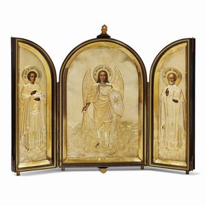 ICONA A TRITTICO, MOSCA, 1890 CIRCA olio su tavola con riza in argento dorato raffigurante San Michele arcangelo [..]