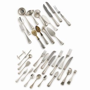 SERVITO DI POSATE, MILANO, SECOLO XX, ARGENTIERE CALDERONI in argento, composto di centotrentasei pezzi, manici [..]