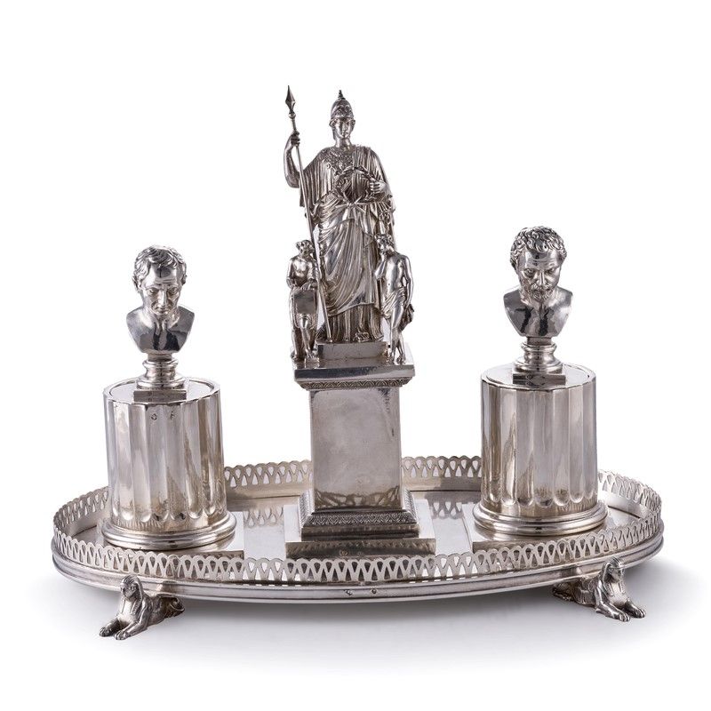 base ovaele poggiante su quattro piedini realizzati come sfingi, porta inchiostro e porta polvere in forma di colonne con tappi realizzati a busti virili, plinto centrale sormontato da figura dell Giustizia, cm 28,5x20, g 1925