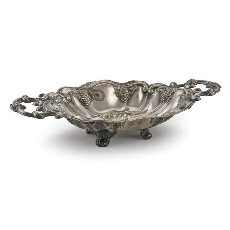 in argento sbalzato, di forma ovale a due anse, cm 41x23, g 325