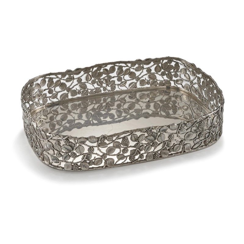 in argento di forma quadrata con alto bordo traforato a tralci vegetalio, cm 30x20, g 1320