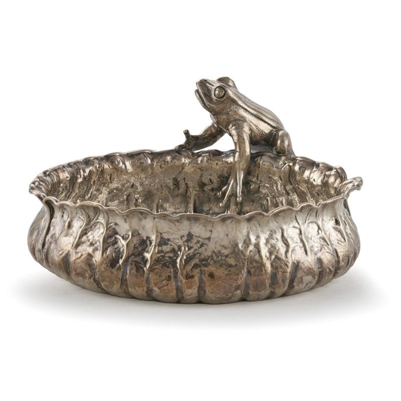 in argento sterling realizzata come una foglia circolare su cui poggia una rana, diam. cm 18, g 445