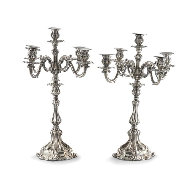 in argento, basi sbalzate con fusti a balaustro, quattro bracci a volute per complessive cinque luci, trasformabili in candelieri, alt. cm 49, complessivi g 2890
