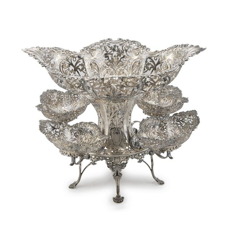 in argento quattro altri piedini in oparte traforatie terminanti a foglie, base ovale da cui si dipartono quattro bracci a volute che sostengono cestini traforati, al centro la coppa , alt. cm 30, g 2060