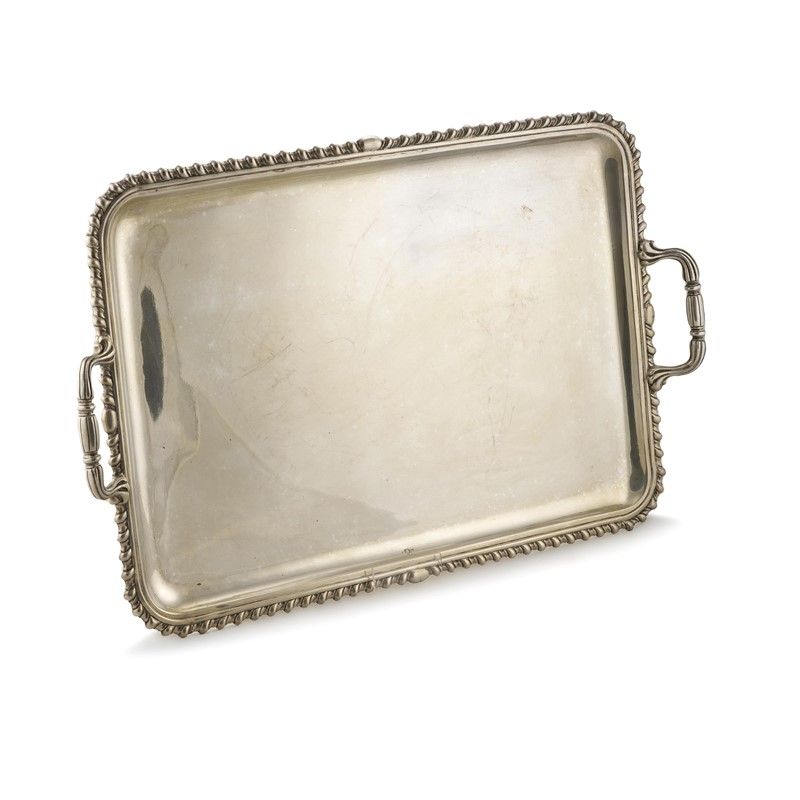 in argento di forma rettangolare con profilo baccellato,cm 59x37, g 2500