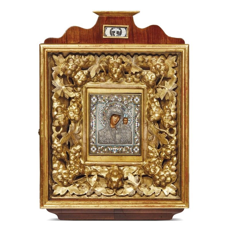 ICONA, RUSSIA, SECOLO XIX tempera su tavola, raffigurante la Madonna con il Bambino benedicente, entro riza in argento decorata da ramage vegetali e perlinature in smalto policromo, cm 15x18. Ricca cornice in legno intagliato e dorato, cm 42x38. L'icona è conservata entro teca in legno, cm 43x63