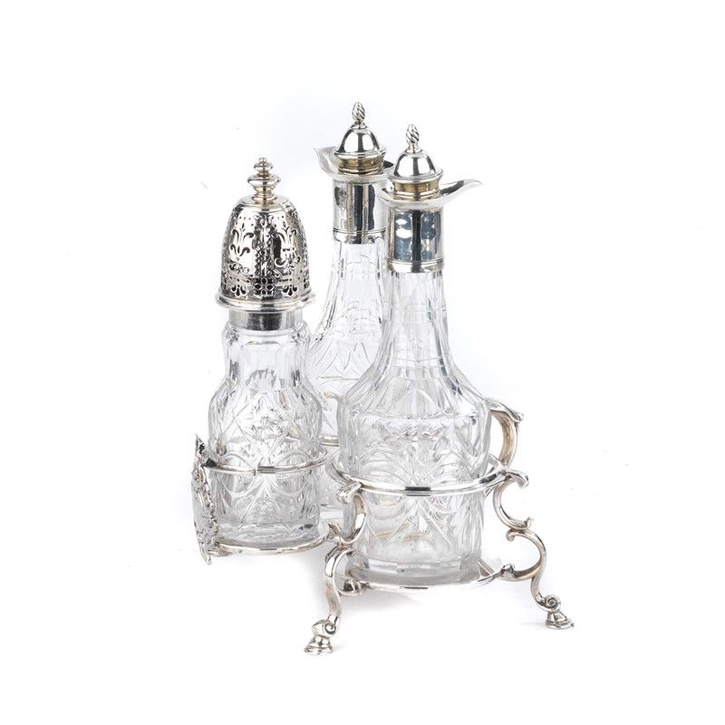 in argento a tre alloggi, presa a voluta, completa di due ampolle e uno spargisale, g 330