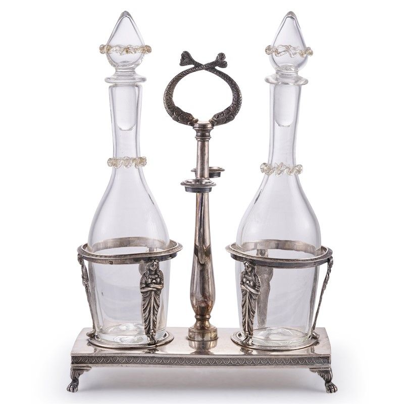 in argento, base rettangolare su piedini terminanti a zampa ferina, porta ampolle su tre sostegni realizzati come figure femminili in vesti classiche, presa a due animali acquatici contrapposti, ampolle non pertinenti, alt. cm 27, g 620