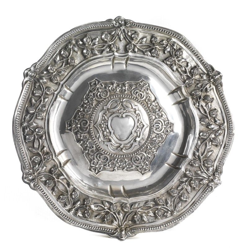 in argento di forma circolare sagomata con profilo perlinato, ampia tesa sbalzata a festoni di melagrane, cavetto umbonato, diam. cm 51, g 1440