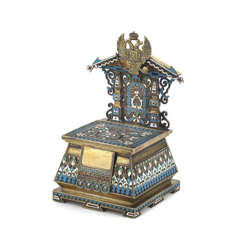 A SILVER GILDED AND ENAMEL THRONE SALT CELLAR. MOSCA, BEGINNING OF 20TH CENTURY