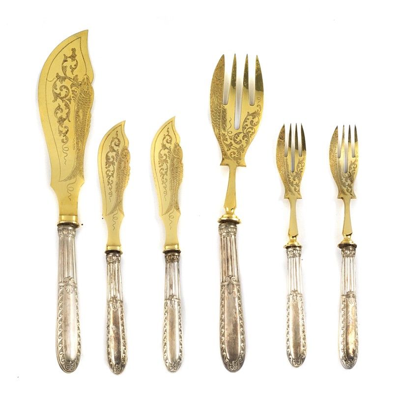 A SILVER AND GILDED METAL FISH CUTLERY SET, GERMANY, BEGINNING OF XX CENTURY