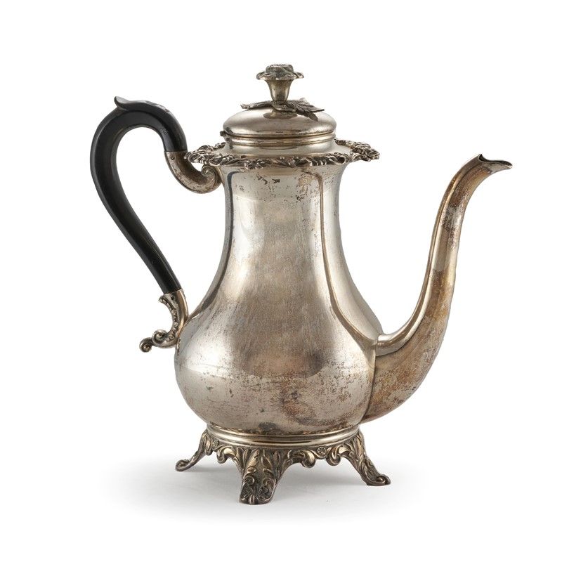 in argento poggiante su quattro piedini a volute, beccuccio sagomato, finale del coperchio in foggia di fiore, alt. cm 25, g 820