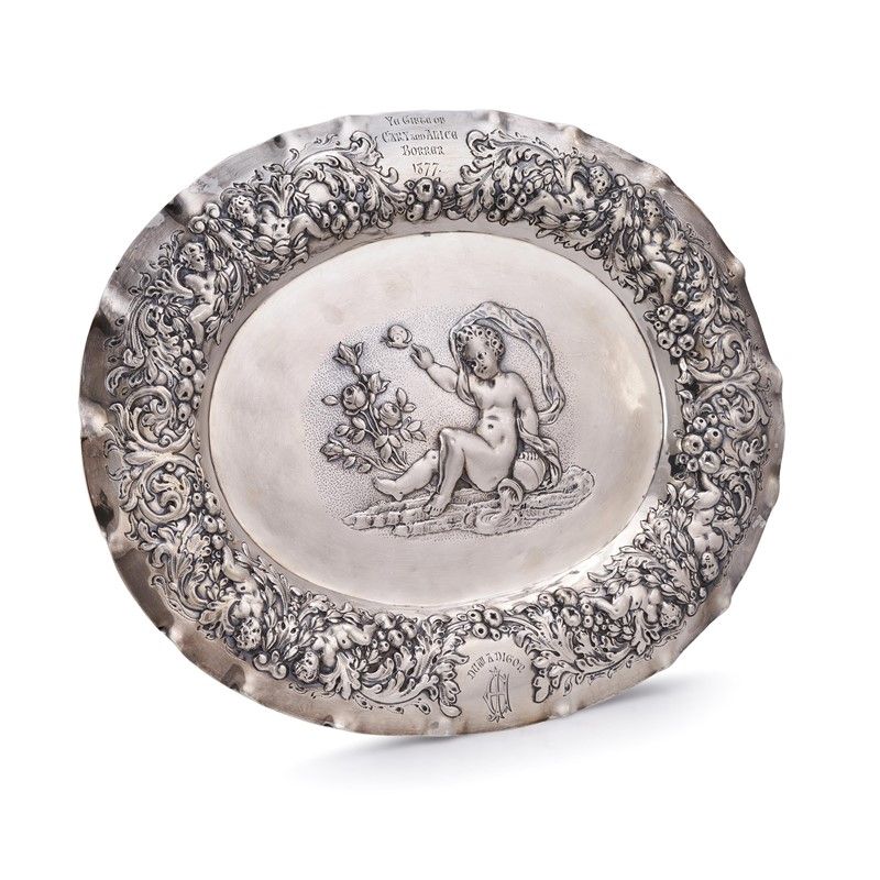 in argento, di forma ovale, tesa decorata a sbalzo con putti tra festoni di frutti, al centro fanciullo con tralcio di ose e farfalle e iscrizione datatat 1877, cm 37x29, g 490.