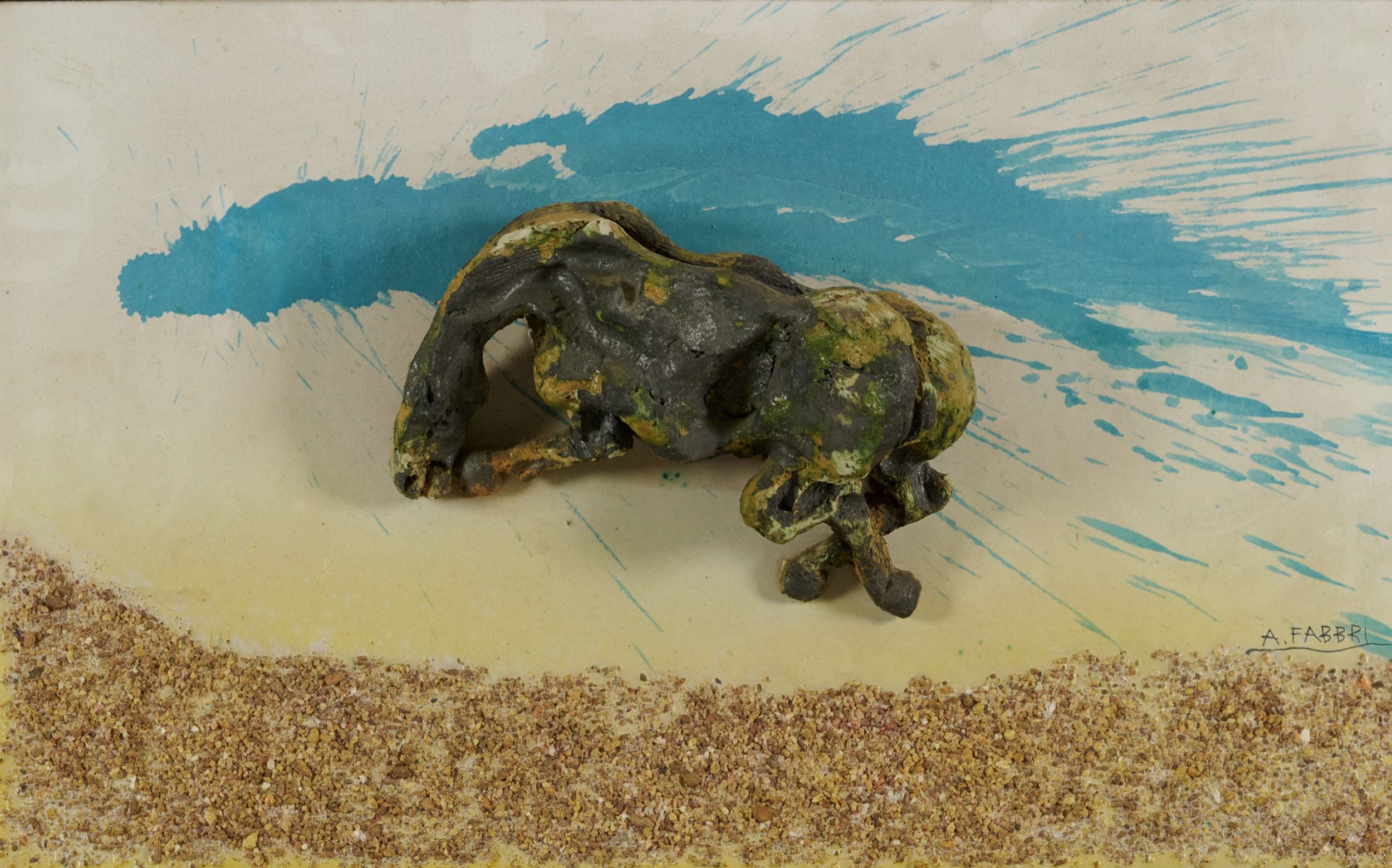 Terracotta policroma e sabbia applicata su formella in terracotta smaltata, cm. 34x55x9