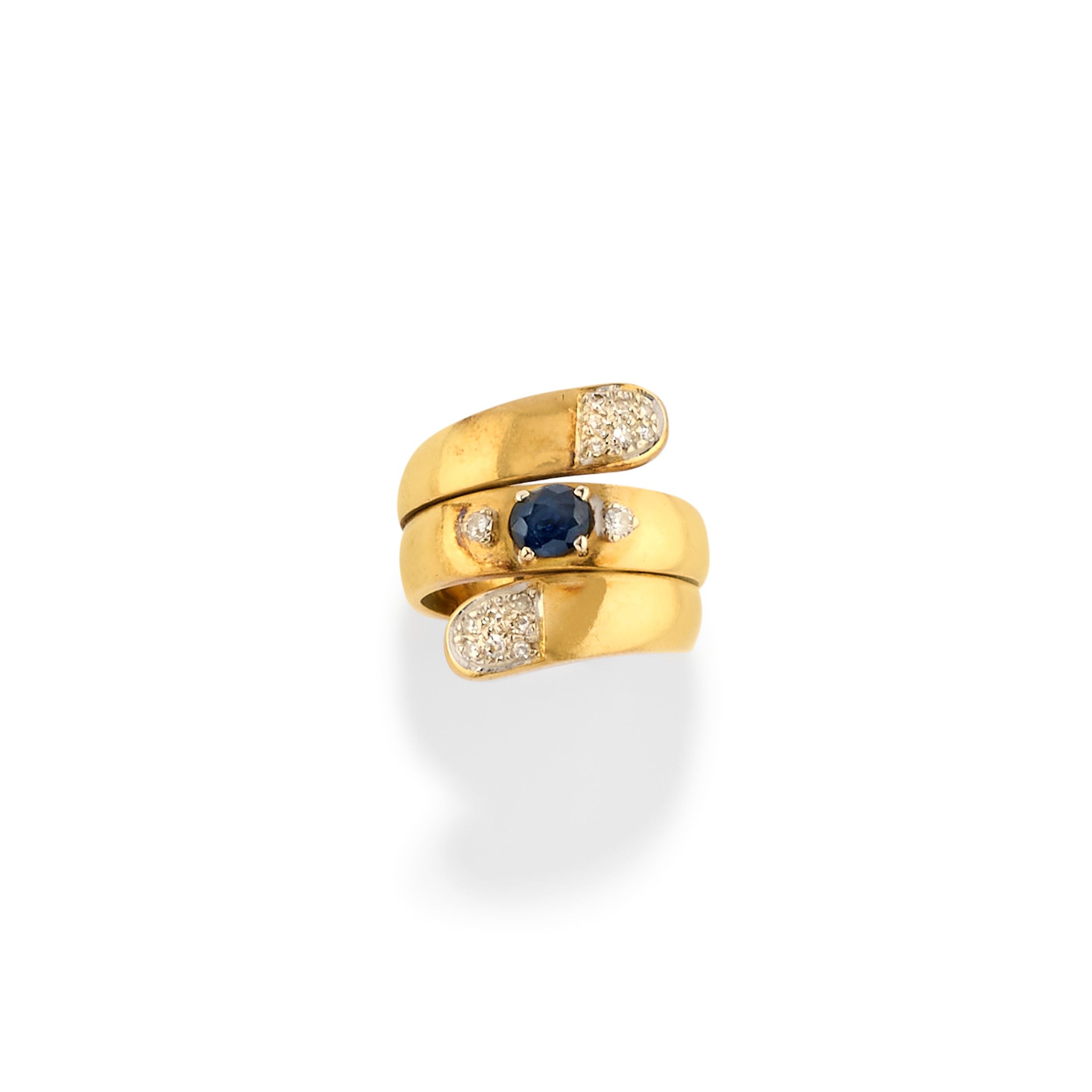 al centro zaffiro taglio ovale, ai lati due piccoli diamanti taglio brillante, terminali in diamanti taglio huit-huit.